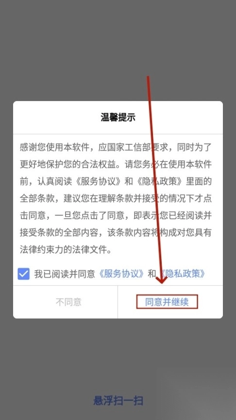 先下载并安装悬浮扫一扫app,安装完成后打开该应用。进入应用界面后,勾选服务协议,接着点击“同意并继续”按钮。