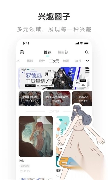 追剧一族、电影痴迷者、绘画热爱者、手账痴迷分子、饭圈男女、国风爱好者、娃圈爸妈、摄影发烧友、旅行行家、COS圈人士、手游玩家、文学发烧友……无论何种兴趣,LOFTER都设有专属标签,助你找到能一起创作、围观、探讨、分享的同好。同时,也希望你认真学习标签使用规范,与我们共同维护标签秩序。