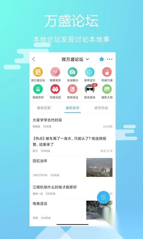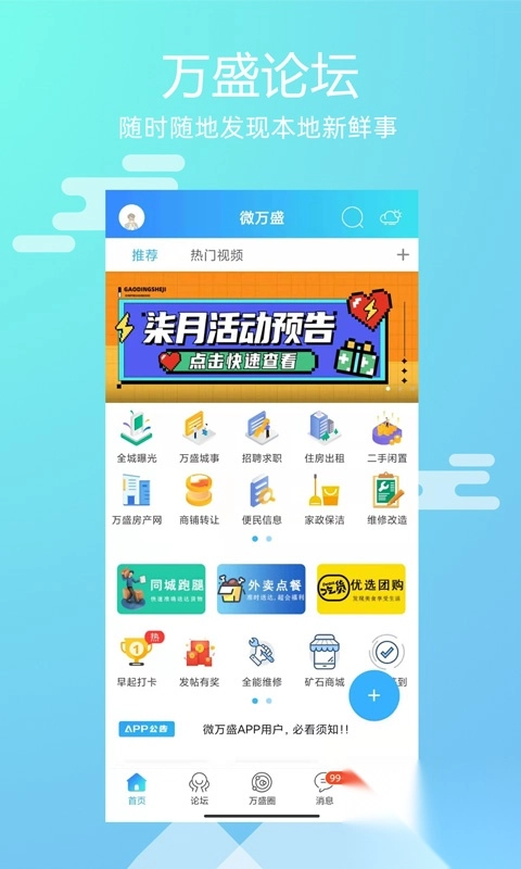 微万盛APP,提供万盛新闻资讯、吃喝玩乐美食推荐、公交查询、房屋租售、招聘求职、同城交友等丰富功能的APP。