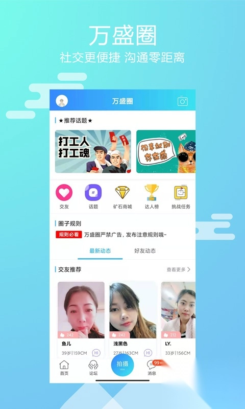 3、交流场:参与城市热门话题、加入兴趣圈子,分享同城生活点滴。