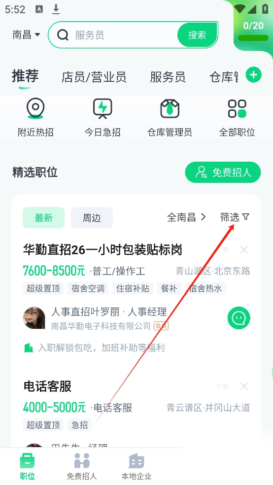 1. 成功下载赶集直招官方版后,打开该软件进行注册登录,接着点击筛选功能。
