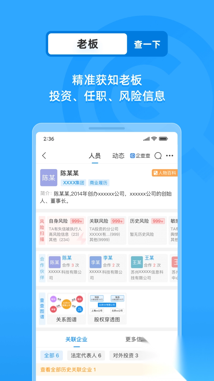 信息全面:和工商局数据对接,查关系,查信用,被执行,专项查询功能即刻找出关联企业或法人股东。