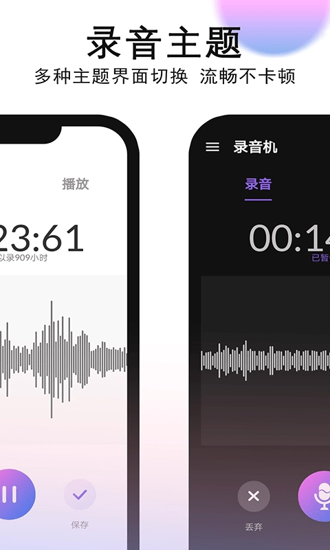 音量增益、跳过静音等效果:屏幕始终开启录音、通话暂停录音等,适用于各种场景的一键录音、音量增益、跳过静音等效果录音。