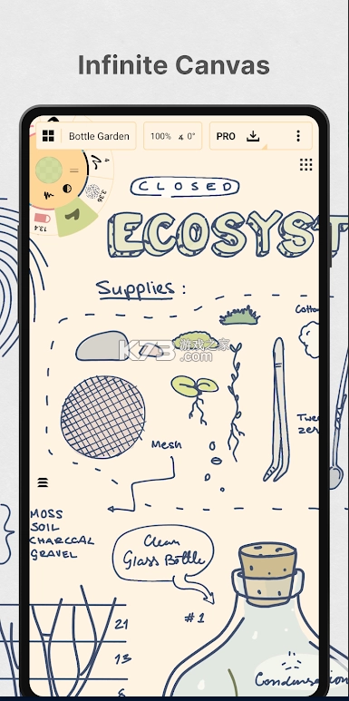 无限画布:允许用户在无边界的空间内自由创作,同时提供流畅的缩放和旋转机制,保证即使在大型项目上也能实现细致入微的操作。此外,它还支持竖排模式和拆分视图多任务处理,使用户在单个屏幕上即可同时处理多个工作区或对比不同阶段的作品。