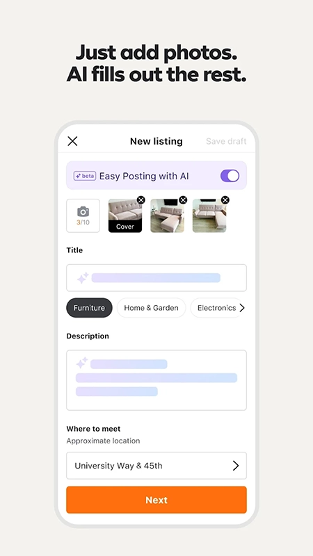 2. 发布物品:点击“Newpost”按钮,挑选物品类别,填写物品详细信息,可自行决定是否接受议价,完成发布后,物品就会展示在附近社区的列表里。