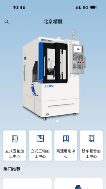 给出了精雕产品的分类入口、产品列表以及热门推荐等内容,像五轴高速加工中心、三轴高速加工中心便是其中例子。