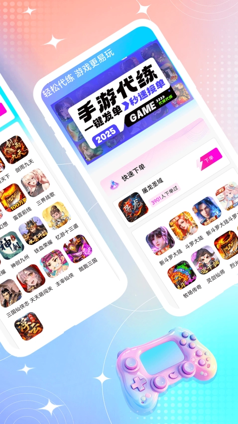 手游代练APP最新版,是一款具备高质量游戏账号代练功能服务的应用软件。它涵盖全网各类游戏代练资源,用户能轻松在线查看不同游戏代练的收费情况。这里所有游戏代练接单速度极快,可轻松满足不同用户对游戏代练的选择需求。