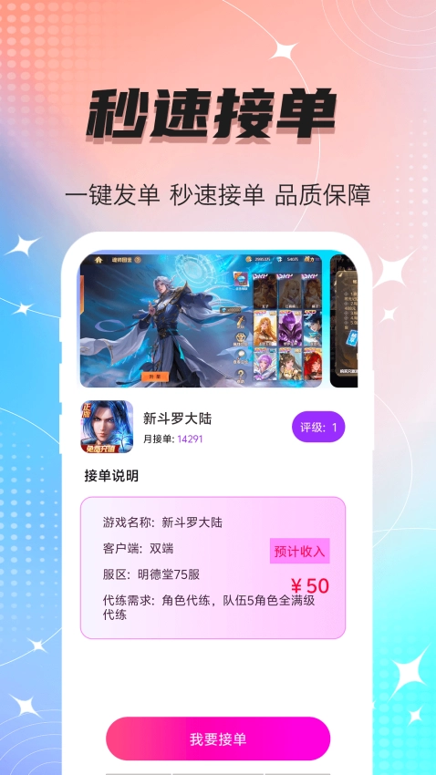 不仅如此,在手游代练官方版APP中,所有游戏代练服务都有强大的保障守护,能更好地保护用户的游戏订单。同时,游戏代练接单十分迅速,用户还能快速查看不同游戏代练的信息介绍。