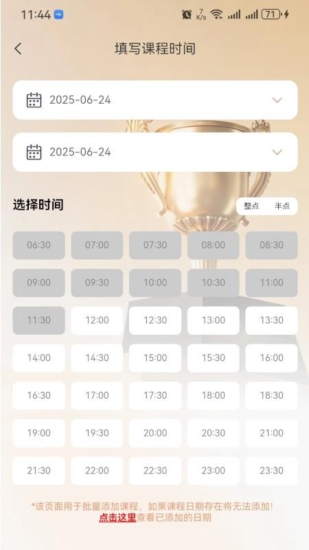 2、填写课程时间,自定义选择时间添加,方便学习能精准预约;
