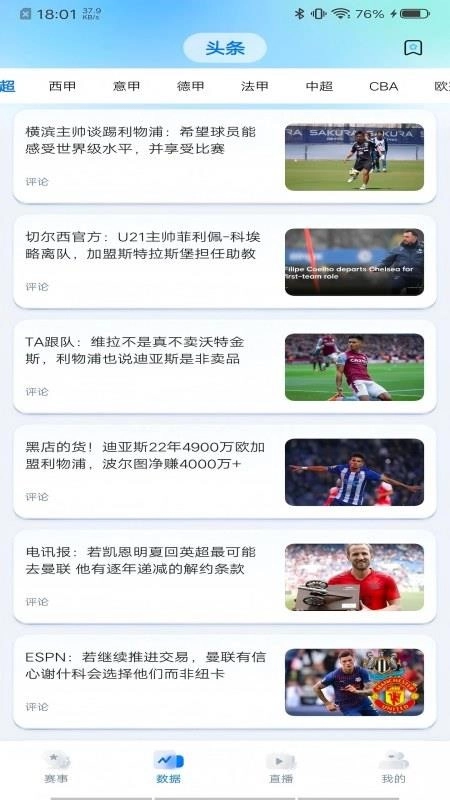 各类赛事以分类形式展现,查看西甲、德甲、中超以及CBA等赛事资讯变得更为简便。