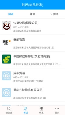 附近网点查询功能,软件会自动定位用户当前位置周边的快速网点,方便用户快速找到快递员取包裹。