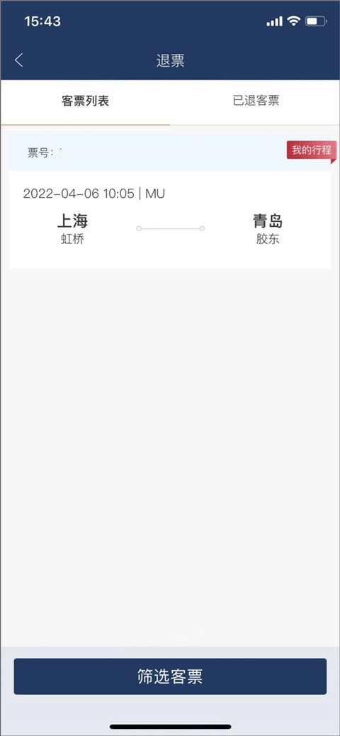 2、在退票界面中的客票列表中选择你要退票的行程