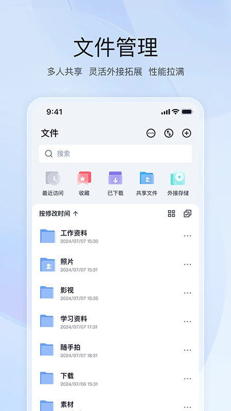 2. 文件管理:具备多用户权限管理与资源分配功能,同时支持多种文件网络传输协议。能够对最近访问、收藏、已下载、共享文件以及外接存储的文件进行管理,并依据修改时间排序,便于查找。