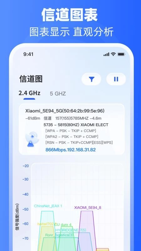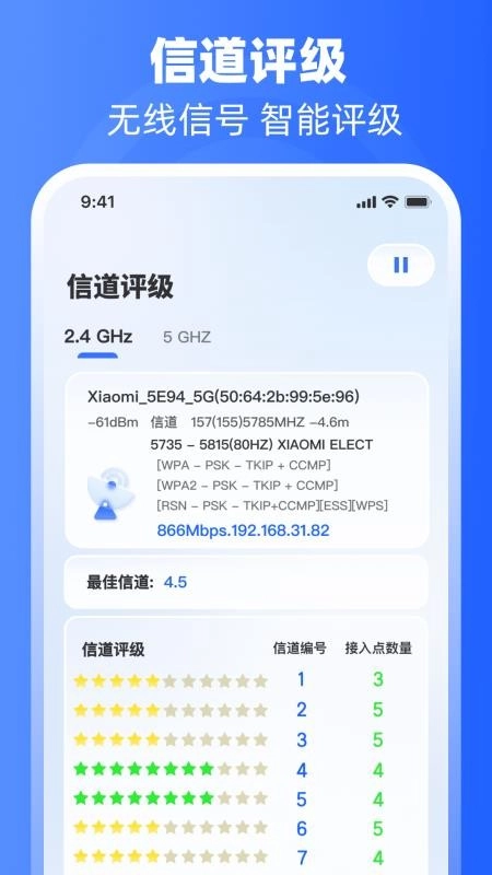 支持用户对WiFi无线信号来实现信道评级,让你智能评级需要的信号,实时评级。