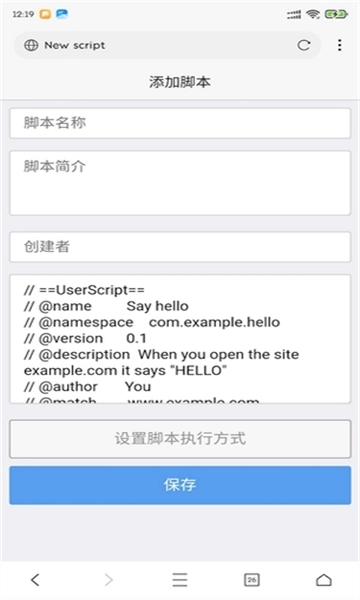 2、直接拷贝脚本代码 有时,我们面对的并非完整的脚本文件。例如,在网上发现一些有用的JS代码片段时,可通过复制/粘贴的方式将其添加到浏览器。具体操作是,前往浏览器设置》浏览器脚本,点击右上角的“添加脚本”按钮,选择“新建脚本”。