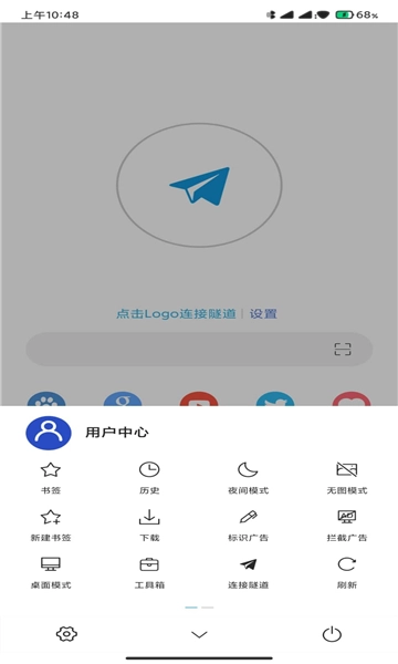 2、App提供多种操作工具,包括收藏夹、历史记录、下载内容、夜间模式等。
