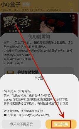 1. 首先下载小q盒子app,完成安装后打开该应用,进入首页。此时若有公告自动弹出,点击“我已知晓”。