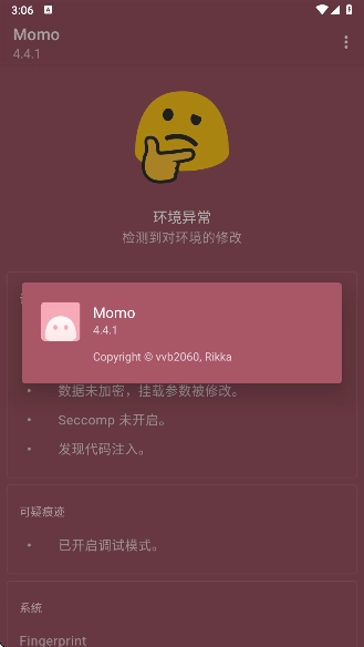 3、检测到对环境的修改:例如Momo处于伪造环境,这不是真的设备。