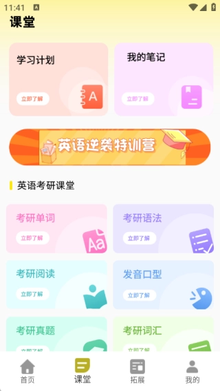 1. 覆盖多元学习场景,设有课堂模块。该模块涵盖单词、语法的基础教学内容,以及阅读、真题的实战演练环节。同时搭配学习计划与笔记功能,科学规划学习路径。