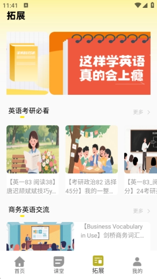 3、于拓展页面,能够知晓英语考研必看要点以及商务英语交流相关内容,并可即时在线学习各类知识。