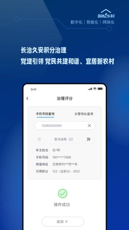 5、进行治理评分,在应用中可通过手机号或房屋地址查询,便于打分;