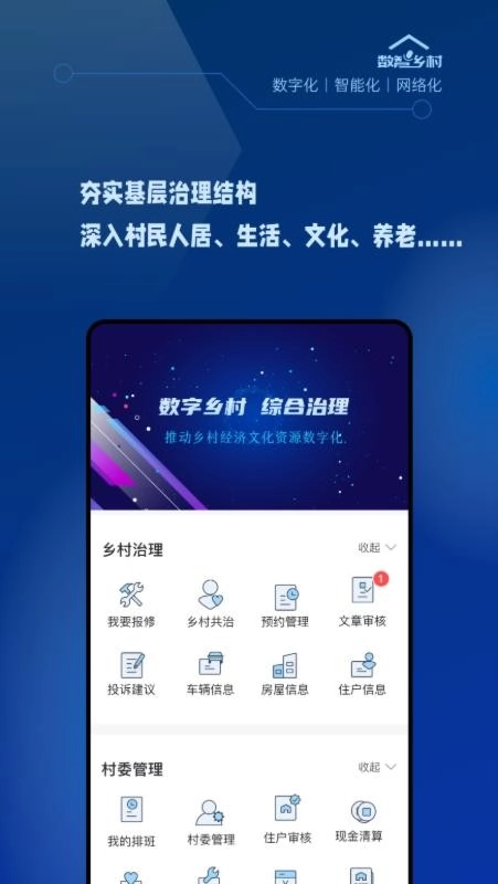1. 在手机上通过在线方式下载安装数智乡村APP,安装完成后就能随时打开该应用开展乡村工作。