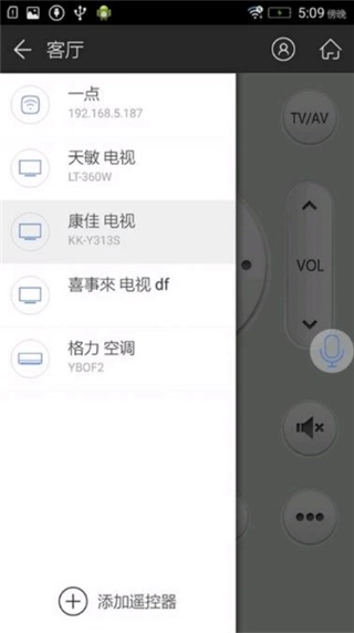 在遥控界面上,从界面左边缘朝右滑动,就会出现遥控器切换菜单,此时直接点击就能切换到其他遥控器。而点击界面右上角的按钮,则可以进入房间选择界面。